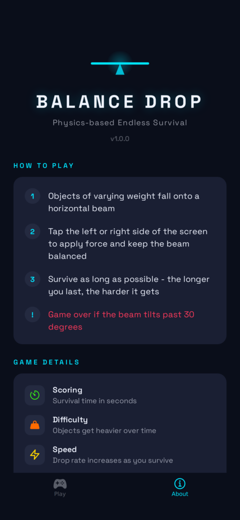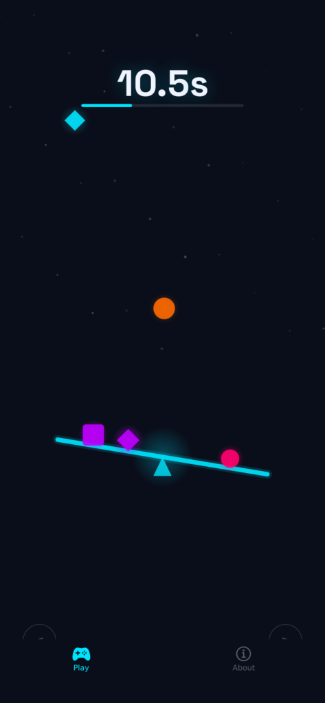 FEATURES — Pure physics simulation with realistic torque and angular momentum — Three object shapes: circles, squares, and diamonds — each with glowing neon effects — Difficulty scales naturally the longer you survive — no arbitrary level gates — Tilt indicator bar at the top gives you a real-time warning before it’s too late — Haptic feedback on every landing and game over — Best score saved locally on your device — Stunning dark neon visual theme — deep space background with glowing objects — Clean, distraction-free design built for one-handed play